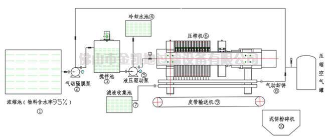 污泥进料泵将搅拌调理后的污泥打进过滤机的滤腔内进行过滤,污泥在进料泵的压力下进行初步过滤脱水处理,释放出间隙水